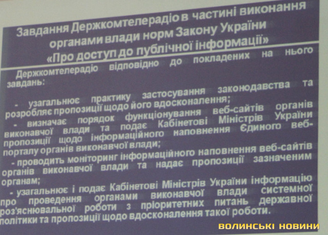 Як розповіла представник Державного комітету телебачення та радіомовлення Ганна Красноступ, торік Уряд прийняв розпорядження, відповідно до якого протягом 2015 року потрібно підготувати законопроект про здійснення державного нагляду у сфері реалізації прав про доступ до публічної інформації. Держкомітет здійснює підготовку вказаного законопроекту та пропонує держслужбовцям звертатися з пропозиціями та зауваженнями. З її слів, кожен може долучитися до законотворчої діяльності і всі слушні пропозиції врахують.