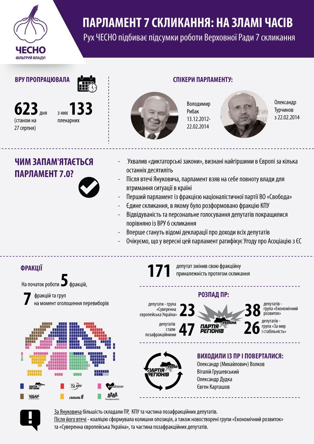 Партійну приналежність протягом скликання змінив 171 депутат, цікаво, що вийти зі складу Партії регіонів та повернутися встигли четверо депутатів – Віталій Грушевський, Олександр Волков, Олександр Дудка та Євген Карташов. Найширший фінансовий звіт Руху «Чесно» надали кандидати Петро Порошенко та Анатолій Гриценко, найменше інформації надали Олег Тягнибок та Сергій Тігіпко. Втім, прохання щодо фінансового звіту було не законодавчим, а стало вимогою громадськості та активістів.