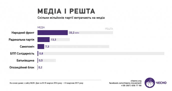 Так, відповідно до результатів дослідження, НФ витратив за рік 33,2 млн грн, партія Ляшка – 13,3 млн, "Самопоміч" – 7,3 млн, БПП – 0,8 млн, "Батьківщина" – 0,5 млн, а "Опозиційний блок" – 0,2 млн.