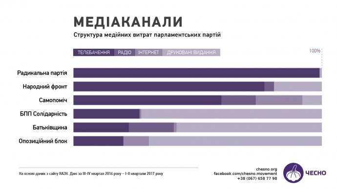 За результатами досліджень, "Радикальна партія", "Народний фронт" та "Самопоміч" найбільше витрачають на телебачення, а БПП, "Батьківщина" та "Опозиційний блок" – на друковані ЗМІ.