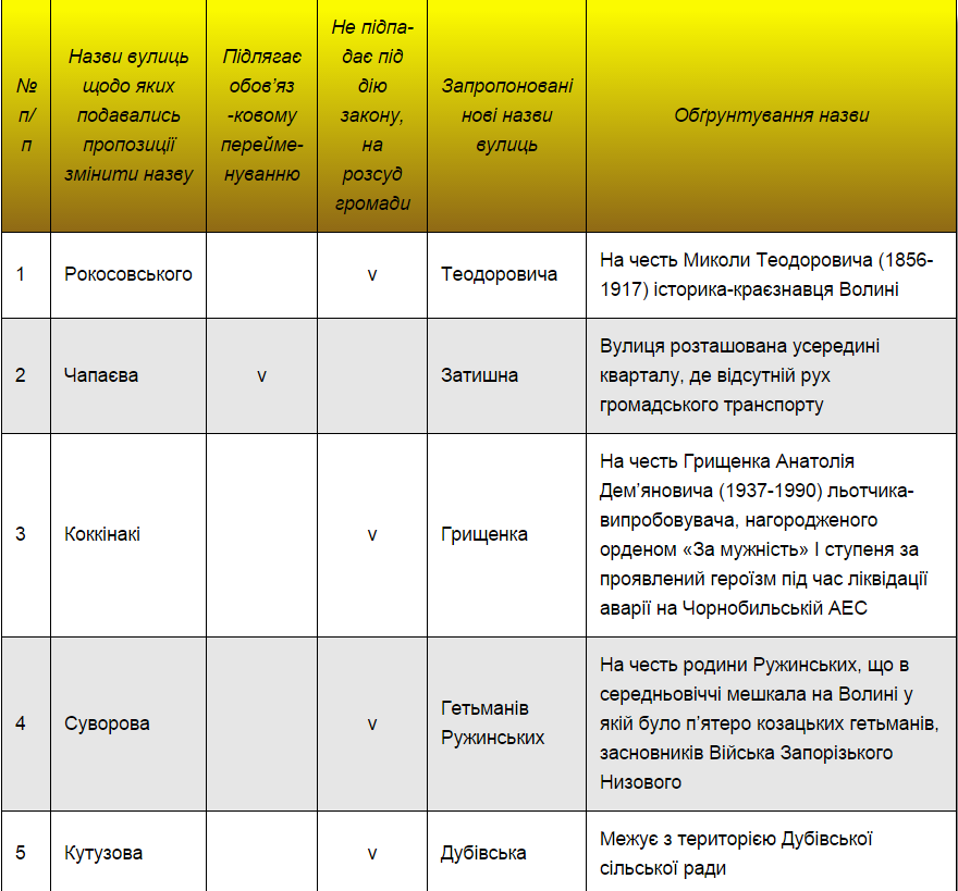 Комісія розглянула всі подані звернення про перейменування вулиць у місті, а також опрацювала перелік назв вулиць та провулків Ковеля, вивчивши думки дослідників та істориків.