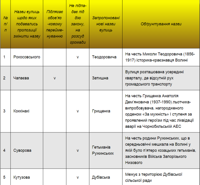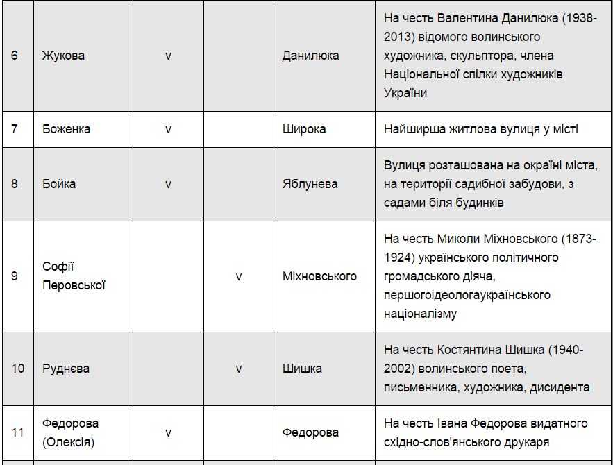 Отже, у новому варіанті вулиці переважно матимуть імена відомих волинян і видатних постатей України.
