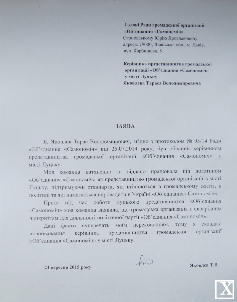 «Моя команда натхненно та віддано працювала під логотипом «Об’єднання «Самопоміч» як представництво громадської організації в місті Луцьку, підтримуючи стандарти, які втілюються громадському житті, в політиці та які намагається впровадити в Україні «Об’єднання «Самопоміч». Проте під час роботи луцького представництва «Об’єднання «Самопоміч» моя команда виявила, що громадська організація є своєрідним прикриттям для діяльності політичної партії «Об’єднання «Самопоміч». Дані факти суперечать моїм переконанням, тому я складаю повноваження керівника представництва громадської організації «Об’єднання «Самопоміч» у місті Луцьку», - зазначи Тарас Яковлев у своїй заяві.
