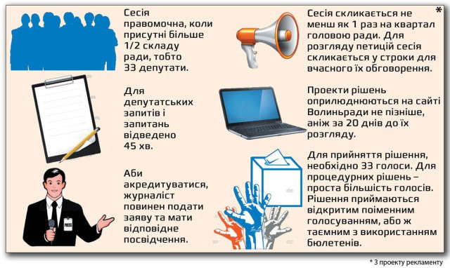 Для пересічного волинянина цей документ важливий тим, що змусить депутатів працювати більш конструктивно в комісіях, а власне сесійні засідання не розтягувати у часі. Не секрет, що попередній склад ради грішив пропуском пленарних засідань, або ж затягуванням рішень чи використанням відведеного часу для політичних розбірок і з’ясування стосунків. У новому ж документі, переконують автори, для усіх цих складових політичного процесу буде свій чітко обмежений час.