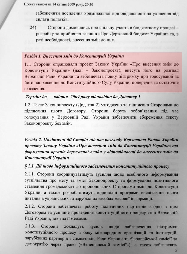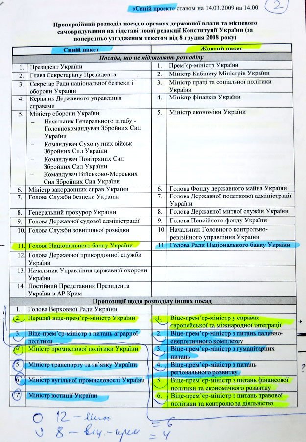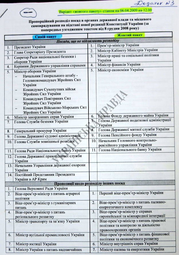Згідно документом, спочатку два терміни президентом мав бути Янукович, а потім два терміни - Тимошенко. На вибори до парламенту вони б йшли єдиним списком. Всі посади в країні ділилися на дві сили. Причому, як видно з документів, вони торгувалися за кожен портфель, - зазначив Лещенко.