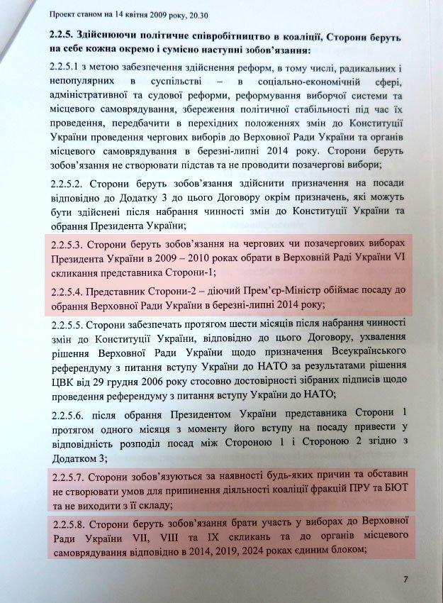 Віктор Янукович і Юлія Тимошенко збиралися укласти договір про політичне співробітництво на 20 років. Домовленості передбачали повний поділ влади між Януковичем і Тимошенко до 2029 року, участь у виборах єдиним списком Партії регіонів та "Батьківщини", а також внесення змін до Конституції для обрання президента в парламенті та проголошення імпічменту президенту Віктору Ющенку.
