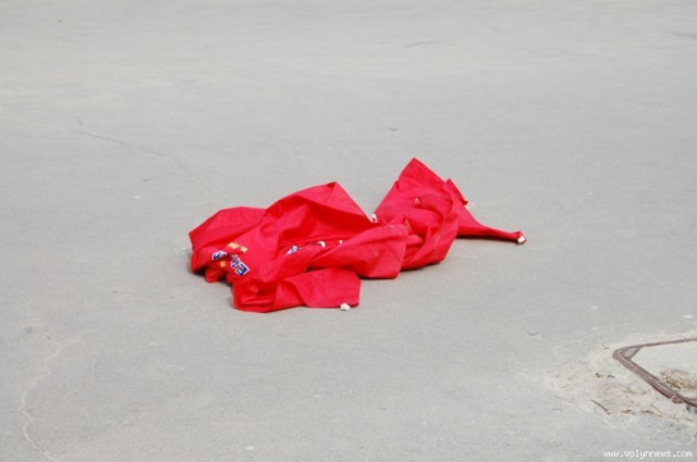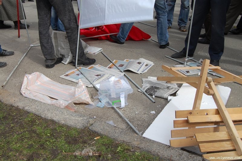 Так і не знайшовши спільної мови зі «сталіністами», націоналісти кількома ривками перетворили червоний намет на купу сміття: зірвали полотнище, зламали опори та дерев’яний столик, який стояв у наметі.