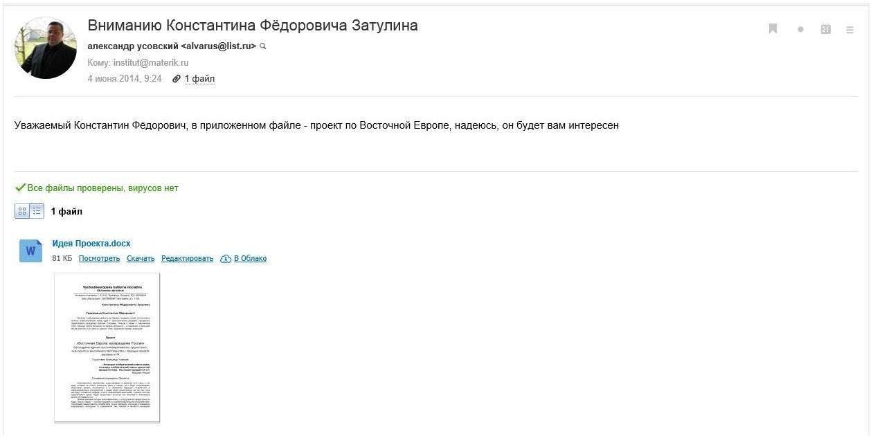 Варто відзначити, що серед отриманих файлів з комп'ютера Усовського, є документ під назвою "Проект: Україна — ЄС". Судячи зі змісту листа, один з авторів документів — Скориков Іван Іванович, він же помічник Костянтина Затуліна.