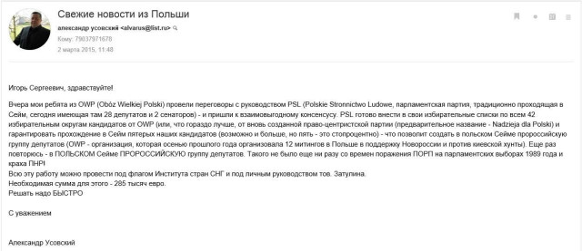 Ідеї Усовського сподобалися депутату-єдинороссу — на їхній спільній зустрічі були обговорені деталі подальшої співпраці і Усовський подякував за оплату "відрядження". Ціна питання проекту – 30 тисяч євро.