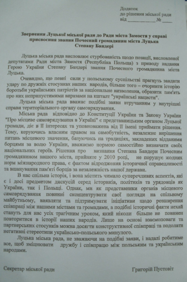 Депутати Луцької міської ради таки прийняли звернення до колег із польського містечка Замостя, які засудили рішення про визнання Бандери почесним городянином Луцька. Щоправда, текст, який пропонувала фракція ВО «Свобода», відхилили. Прийняли так званий «альтеративний» варіант.