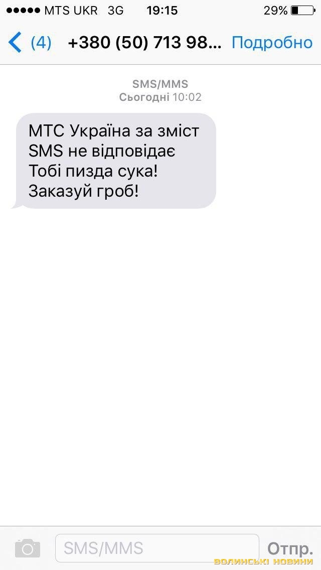 Одне з таких повідомлень, яке надійшло на особистий номер Ігоря Поліщука, він продемонстрував під час прямого ефіру.Аналогічне повідомлення надійшло і на телефон військовослужбовця 51-ї ОМБ, депутата міськради Олександра Кравченка.