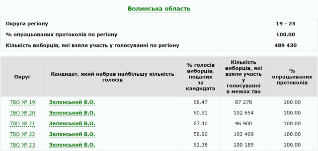На усіх виборчих округах Волині після опрацюювання 100% протоколів перемогу у другому турі виборів Президента України здобув Володимир Зеленський. Його підтримали 63,42 % (310 445) волинян.