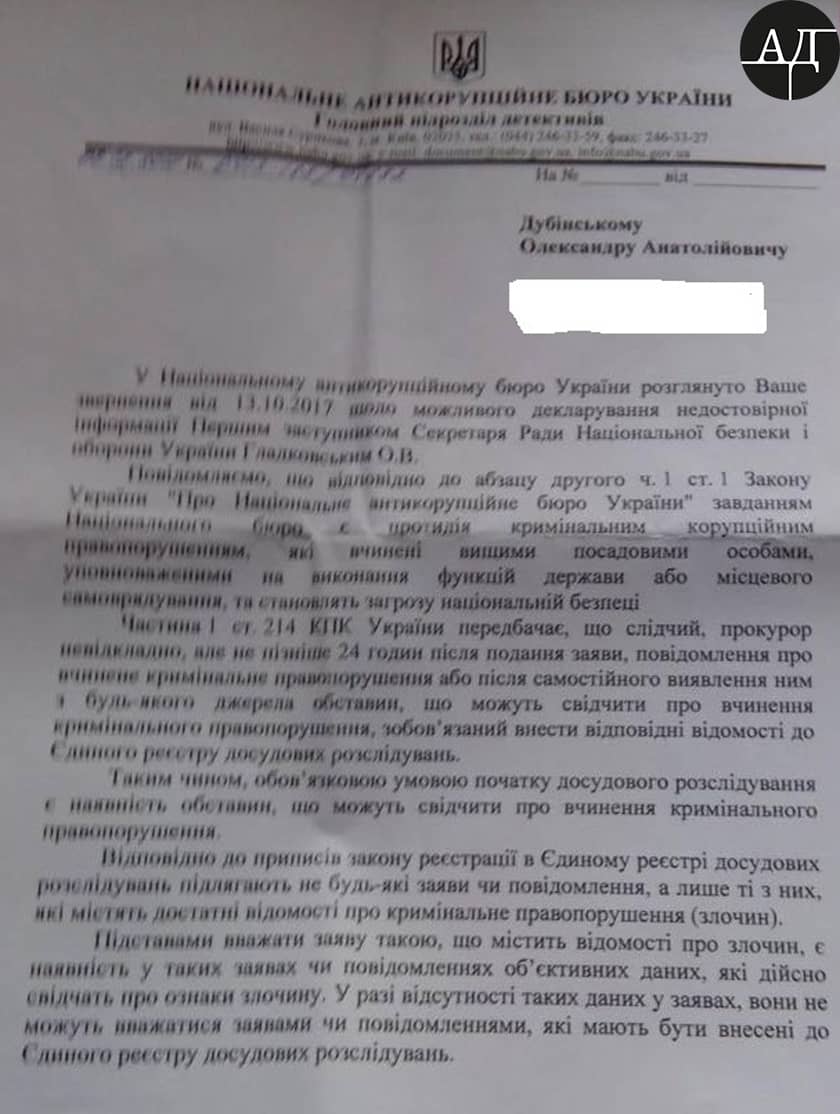Так, НАБУ відмовило Дубінському у початку досудового розгляду щодо Олега Гладковського: «Оскільки в Вашому звернені не наведено конкретних, об’єктивних та фактичних відомостей, які б вказували на наявність у діях Гладковського О.В. ознак складу злочину…»