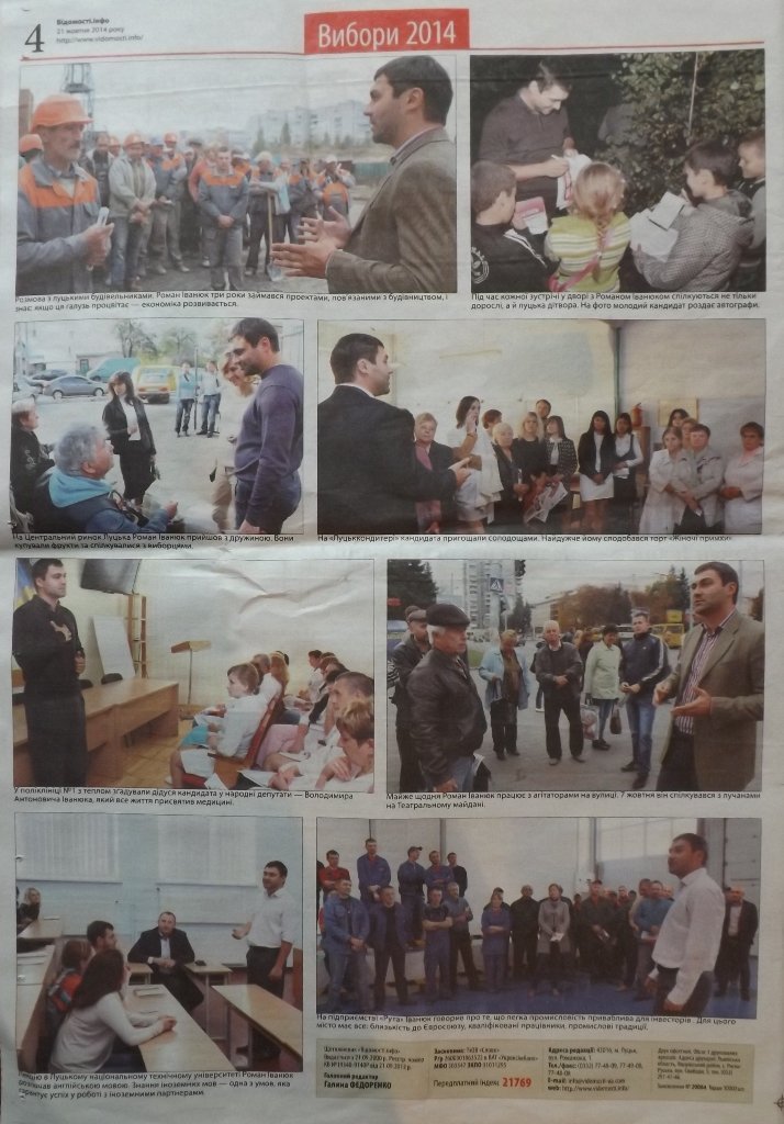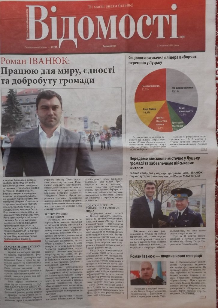 Спецвипуск газети “Відомості.інфо” за 21 жовтня присвячений загалом кандидату в народні депутати, який балотується по одномандатному виборчому округу № 22 від Блоку Петра Порошенка Роману Іванюку.