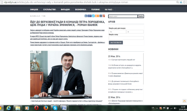 У Волинському інформаційному порталі є інтерв'ю з кандидатом в народні депутати Романом Іванюком без позначки, що це - політична реклама. Матеріал починається з заголову «Йду до Верховної Ради в команді Петра Порошенка, щоб Луцьк і Україна змінилися. Такий матеріал має ознаки “джинси”. - резюмує Опора.