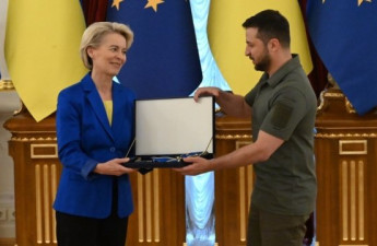 Очільниця Європейської комісії Урсула фон дер Ляєн отримала з рук Президента України Володимира Зеленського орден Ярослава Мудрого І ступеню.