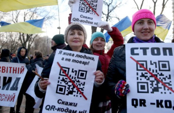 Антивакцинатори вийшли на акцію протесту в Києві з QR-кодами «Єдиної Росії»