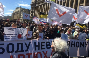 У Москві проходить санкціонований мітинг під гаслом "Досить Путіна". На проспекті Сахарова зібралося кілька тисяч людей. Місце проведення акції оточене тимчасовим металевим огородженням, вхід лише після огляду поліцією