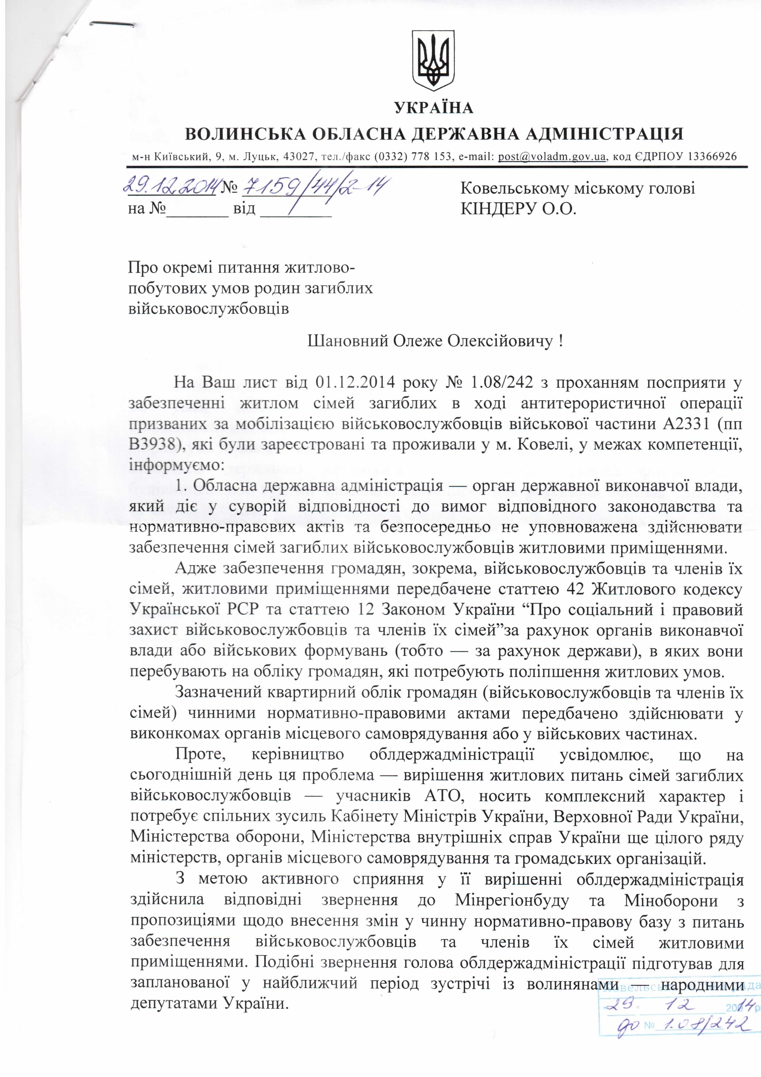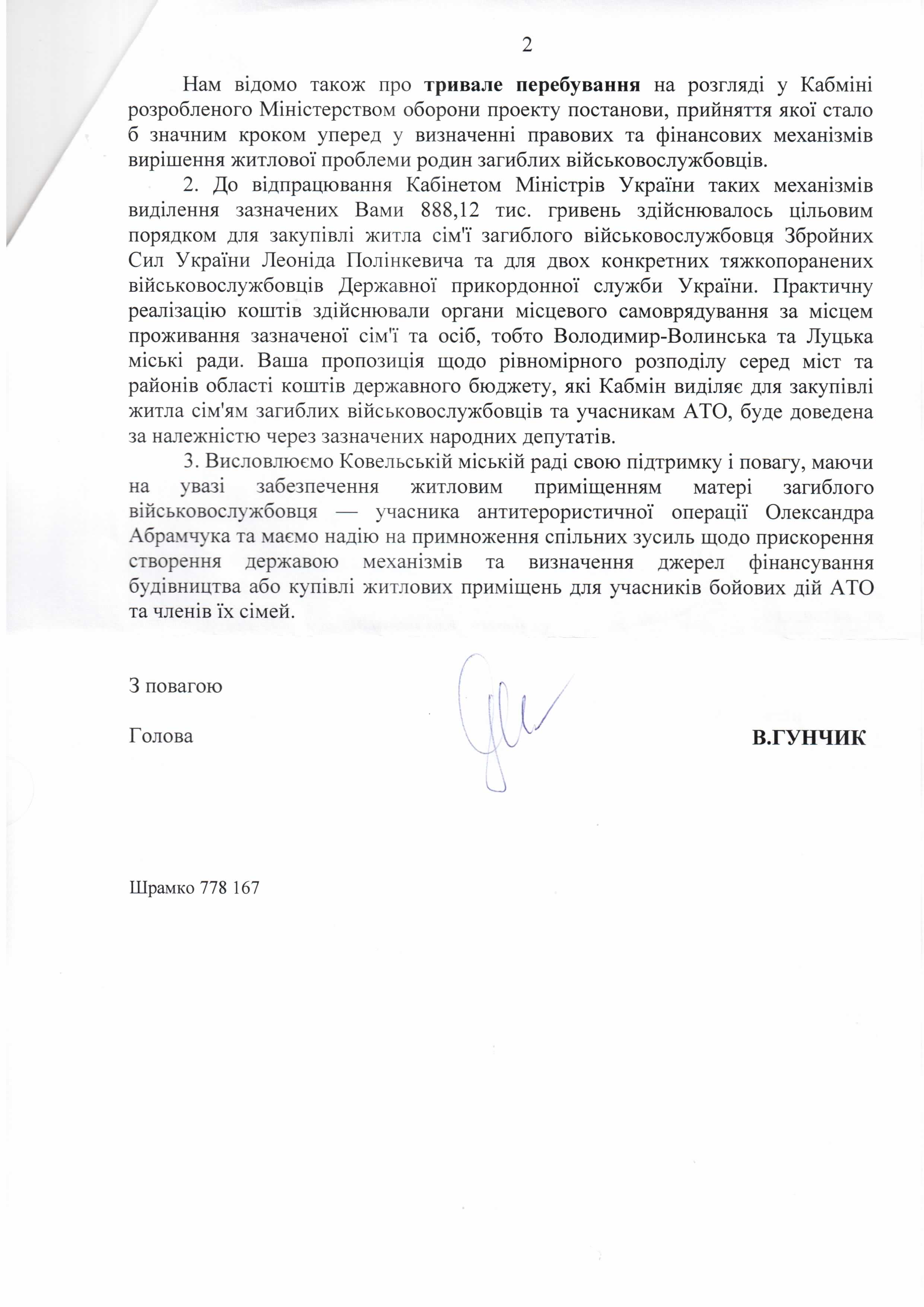 «На адресу виконавчого комітету Ковельської міської ради надходять звернення родин сімей загиблих військовослужбовців, які брали безпосередню участь в антитерористичній операції, по питанню забезпечення їх житлом. Кабінетом Міністрів України прийнято розпорядження від 13.08.2014 року за №729-р та постанову від 23.09.2014р. № 476 щодо виділення з резервного фонду держбюджету кошти на закупівлю житла для сімей загиблих в АТО військовослужбовців. З постанови КМУ вбачається, що за рахунок бюджетних коштів будуть забезпечуватися житлом ті сім’ї загиблих військовослужбовців, які перебувають на обліку громадян потребуючих поліпшення житлових умов.