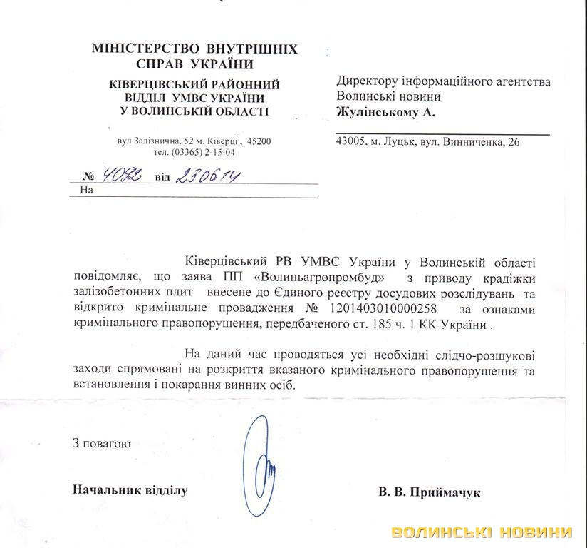 Відповідь надійшла датованою 23 червня – майже за місяць. Згідно з інформацією, отриманою від правоохоронців, заяву ПП «Волиньагропромбуд» внесли до Єдиного реєстру досудових розслідувань та з цього приводу відкрили кримінальне провадження. Нині ж «проводяться всі необхідні слідчо-розшукові заходи». Більше інформації від правоохоронців отримати не вдалося.