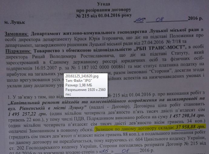 Тим не менш, департаментом житлово-комунального господарства уклав з «РБП ТРАНС-МОСТ» ще два договори підряду. Перший - на капітальний ремонт підходів до мосту та колесовідбійного огородження, підписаний 1 квітня 2016 року з терміном виконання робіт 1 грудня 2016 року.Та другий, договір про капітальний ремонт деформаційних швів шляхопроводу, укладений 14 вересня, де сторони домовлялися закінчити роботи 31 грудня 2016 року. Директор департаменту житлово-комунального господарства Луцької міської ради Юрій Крась переконує, що умови обох договорів дотримано, і в терміни вони вкладаються.