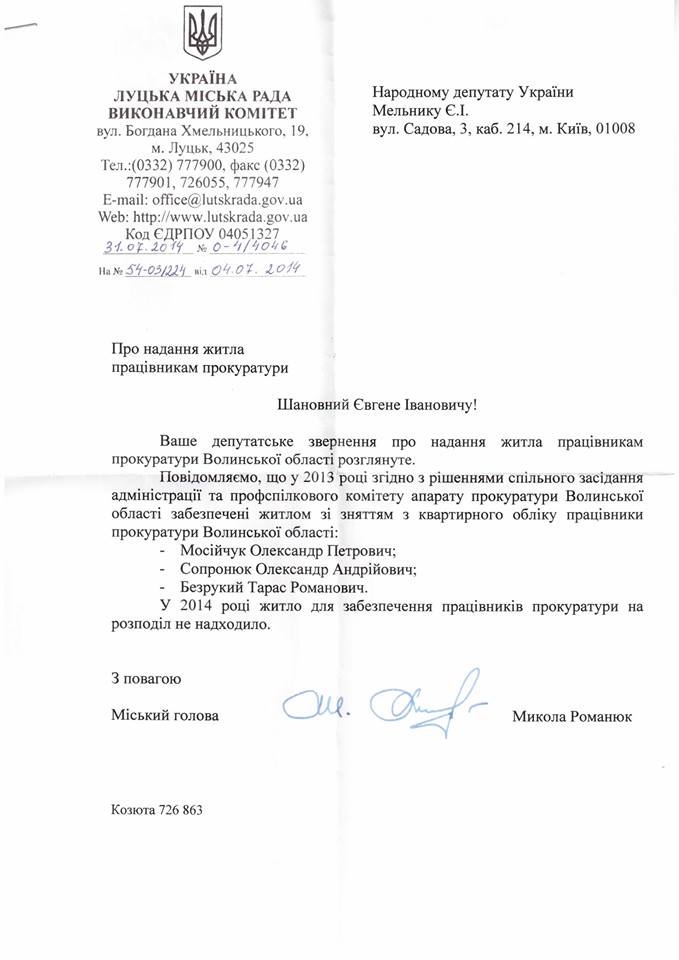 «Отримав відповідь на звернення про те, скільки квартир отримали працівники прокуратури Волинської області», - написав нардеп на своїй сторінціу Фейсбуці та розмістив відповідь на депутатське звернення.