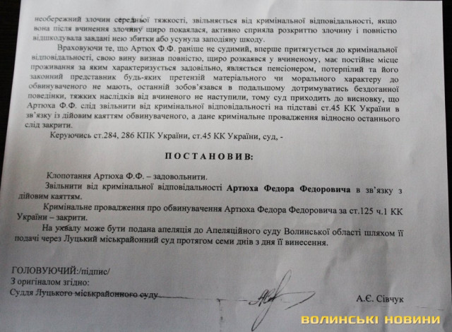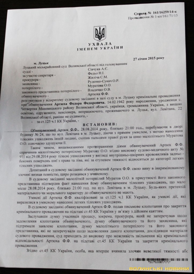 Окрім цього, там відбувається насильство в сім’ї, оскільки щодо чоловіка Артюхової А.Г. є обвинувальний висновок Луцького міськрайонного суду за нанесення тілесних ушкоджень одному з синів Оксани Владичко. У висновку йдеться про те, що обвинувачений Федір Артюх умисно завдав тілесних ушкоджень неповнолітньому сину Оксани Владичко.Під час розмови Оксана Владичко повідомила депутату, що наразі є вільна неприватизована квартира за адресою: місто Луцьк, вулиця Польова, 3, квартира 18.