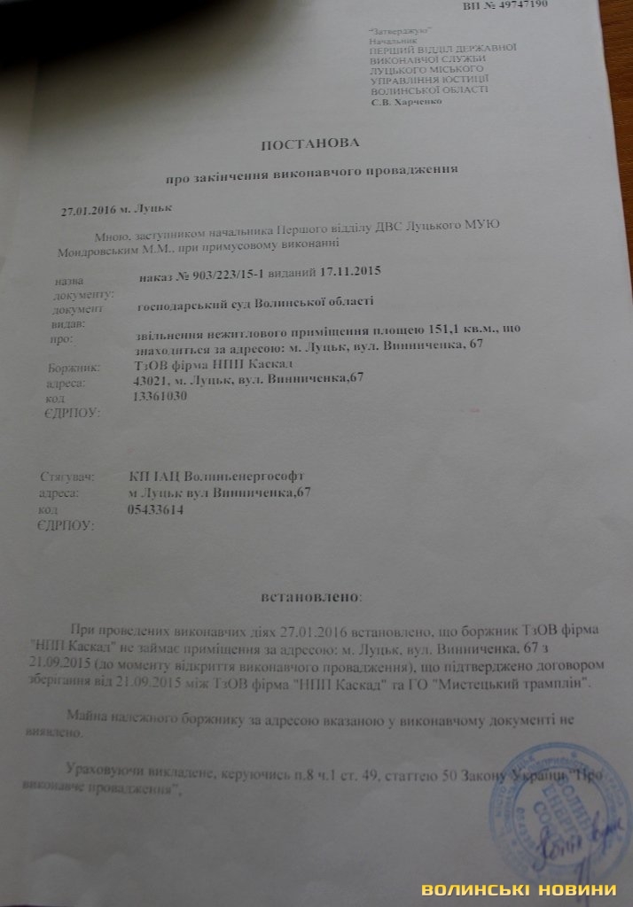 Отож, «Волиньенергософт» мусило звернутися до суду, аби стягнути з МПП «Каскад» борг. Але згодом виконавча служба повідомила, що грошей з яких би фірма могла сплатити борг, немає, майна МПП «Каскад» теж немає.
