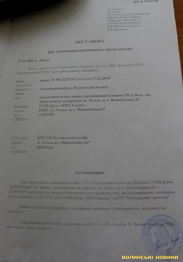 «Термін договору оренди закінчився, але МПП «Каскад» продовжував орендувати приміщення. Ми подали заяву до суду про те, щоб їх виселити примусово. Рішення суду пройшло всі інстанції, у тому числі й Вищий господарський суд, і вступило в законну силу. Було відкрите провадження. 27 січня проводилися виконавчі дії. Виконавець прийшов з працівниками Луцького відділу поліції. Але при проведенні виконавчих дій встановили, що боржник МПП «Каскад» не займає приміщення, що підтверджено договором зберігання між МПП «Каскад» та ГО «Мистецький трамплін». Тобто фірма, не маючи права на це приміщення, передає це його якійсь організації», - зауважила юрисконсульт.Вона пояснила: укладений договір має бути тристороннім: між власником (обласною радою), балансоутримувачем (КП «Волиньенергософт») і орендарем. А МПП «Каскад» не мало підстав передавати комусь приміщення, яке навіть не займає.
