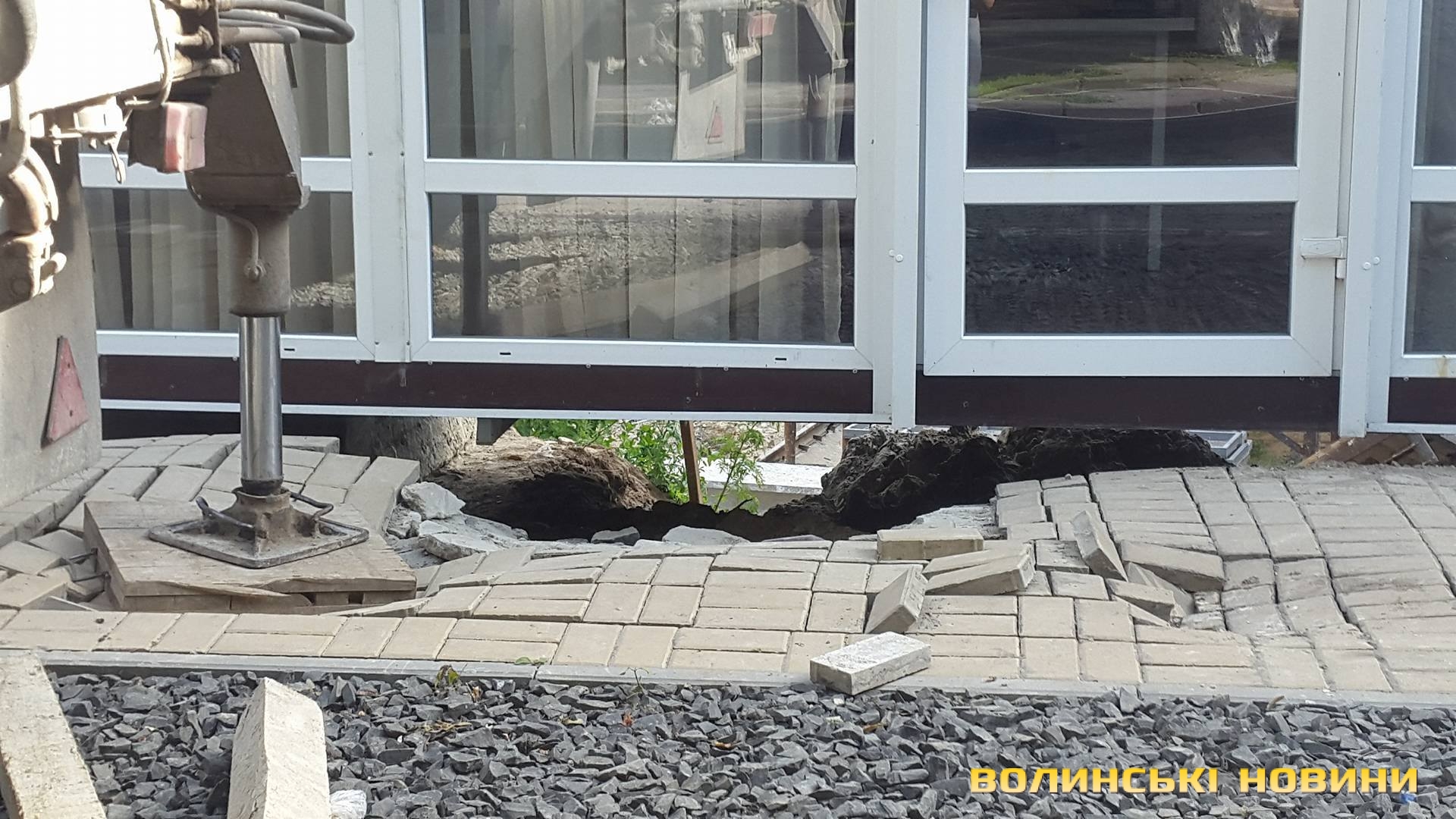 Зі слів менеджера офісу попереднього продажу, павільйон підмило під час шквальної зливи, яка пройшлася Луцьком минулого четверга. «Через декілька днів приміщення почало з’їжджати просто з-під ніг, проте ніхто не постраждав і все цілком безпечно», - каже дівчина.
