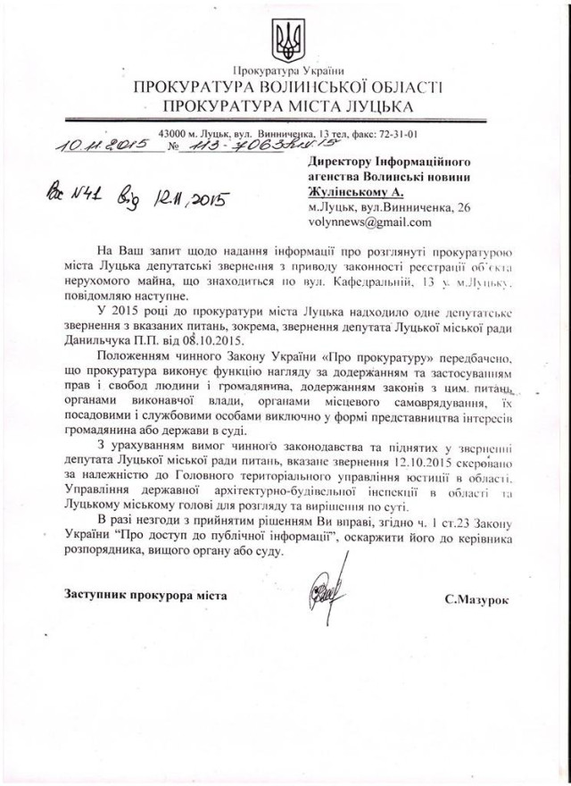 «На Ваш запит щодо надання інформації про розглянуті прокуратурою міста Луцька депутатські звернення з приводу законності реєстрації об’єкту нерухомого майна, що знаходиться пна вулиці Кафедральній, 13 у місті Луцьк повідомляю наступне.