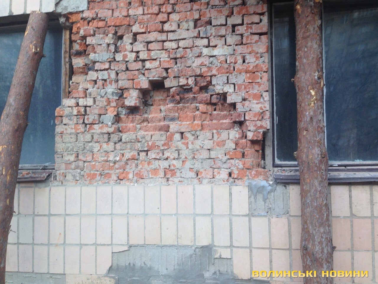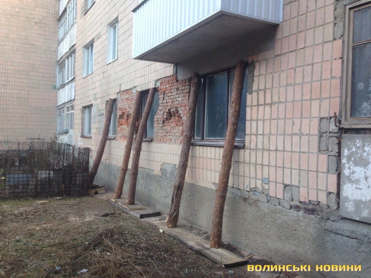 До Інформаційного агентства Волинські Новини звернувся мешканець згаданого будинку Сергій, який розповів, що днями всі сусіди звернули увагу на дивні конструкції, якими підперли невідомі люди стіну будинку. Так, стіни підперли дерев’яними колодами, а зі стіни заледве не випадають цеглини.З його слів, ще минулого літа на першому поверсі одну з квартир викупила невідома особа і там розпочали ремонт. Чоловік припускає, що власник квартири забажав розширити площу і винести фасад квартири за межі будинку.