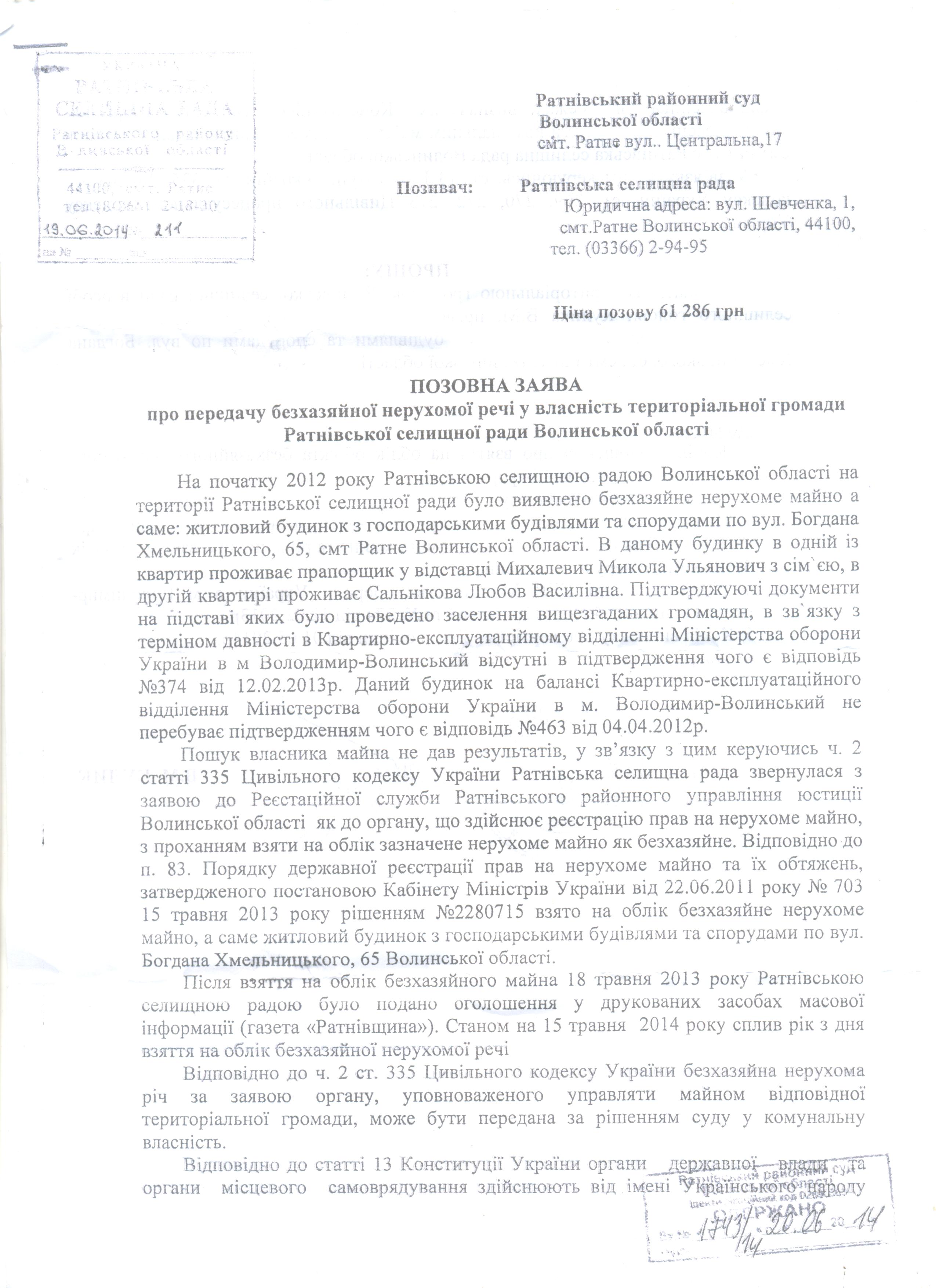 Із даного позову слідує що на початку 2012 року Ратнівською селищною радою на території ради було виявлено! безхазяйне нерухоме майно, а саме: житловий будинок з надвірними будівлями і спорудами! і це притому що В. Кулик є сільським головою з 2006 року лише у 2012 році виявив безхазяйне майно, хоча ще до появи В.Кулика у Ратному і у селищній раді кожен ратнівчанин знав, що цей будинок належить військовим.