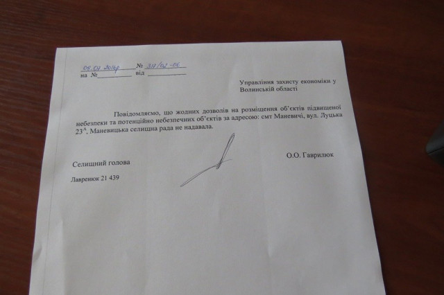 – 6 липня до мене звернулися жителі вулиці Луцької із запитанням, чи давала селищна рада дозвіл на розташування газової заправки на території, що належить одному з підприємців селища Маневичів. Виїхав до людей, пояснив, що до селищної ради по погодження ніхто не звертався, більше того, в РДА теж про цей об’єкт не знали, – розповідає Олександр Оксентійович. – Звернулися з листом до управління захисту економіки Волинської області, РДА працює в цьому напрямку, думаю, що питання буде розв’язано на користь людей.
