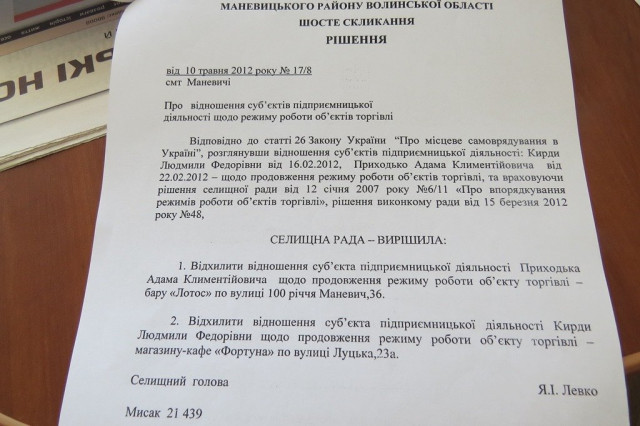 – Ми не будемо мовчати, хочемо, щоб заправку навпроти будинків прибрали, кудись перенесли. У нас є діти, внуки, ніхто не подумав про їхнє здоров’я. Чому мають дихати газом, для чого нас труїти? – каже одна з мешканок Надія Шумік.Ініціативні жінки пішли до селищного голови Олександра Гаврилюка, той, своєю чергою, залучив до розв’язання ситуації голову райдержадміністрації. Люди наполягають, що газова заправка розташована надто близько до будинків та електропідстанції. Чиновники запевнили, що з’ясують усе без скандалів.Бар біля траси, за десяток кроків від якого поставили цистерну, не зачиняється для клієнтів ніколи. Хоч селищна рада встановила режим роботи закладів торгівлі у Маневичах до опівночі. І коли суб’єкт підприємницької діяльності Кирда Людмила Федорівна у 2012 році зверталася до селищних депутатів із проханням погодити цілодобовий графік, їй відмовили. Відповідно, магазин-кафе «Фортуна» працює з порушеннями вже кілька років. А коли люди повстали проти заправки й заодно розповіли селищним урядникам, що біля бару часто шум-гам, п’яні бійки, буває поножовщина, то вивіску закладу зняли.