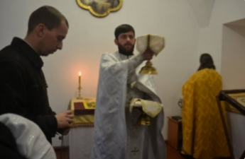При освітленні самими лише свічками в храмі Архістратига Михаїла, що в Нововолинську на вулиці Некрасова, 72, служить акафісти клірик священик Олексій Гольчук.