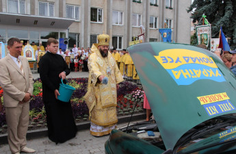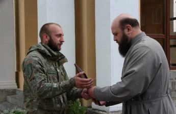Біля кафедрального собору святої Трійці Луцька представник добровольчого батальйону «Січ» командир роти Максим Морозов передав керуючому єпархією вдячність від бійців цього формування