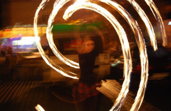 На Театральному майдані Луцька зібралася колядувати молодь. Їх ідею підтримали фаєрщики з вогняним шоу