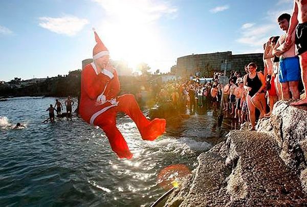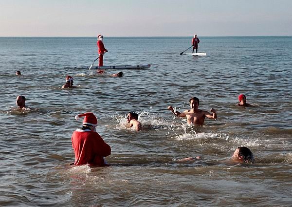 «Моржі» англійського міста Брайтон щороку на Різдво влаштовують купання в крижаній воді. З теплого одягу на учасниках заходу Christmas Day dip може бути хіба що костюм Санта Клауса.