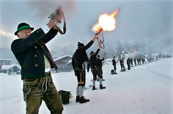 Чоловіки з баварського високогірного селища Шьонау на честь Різдва вбираються в традиційні костюми, виходять надвір та від душі стріляють із ручних мортир.