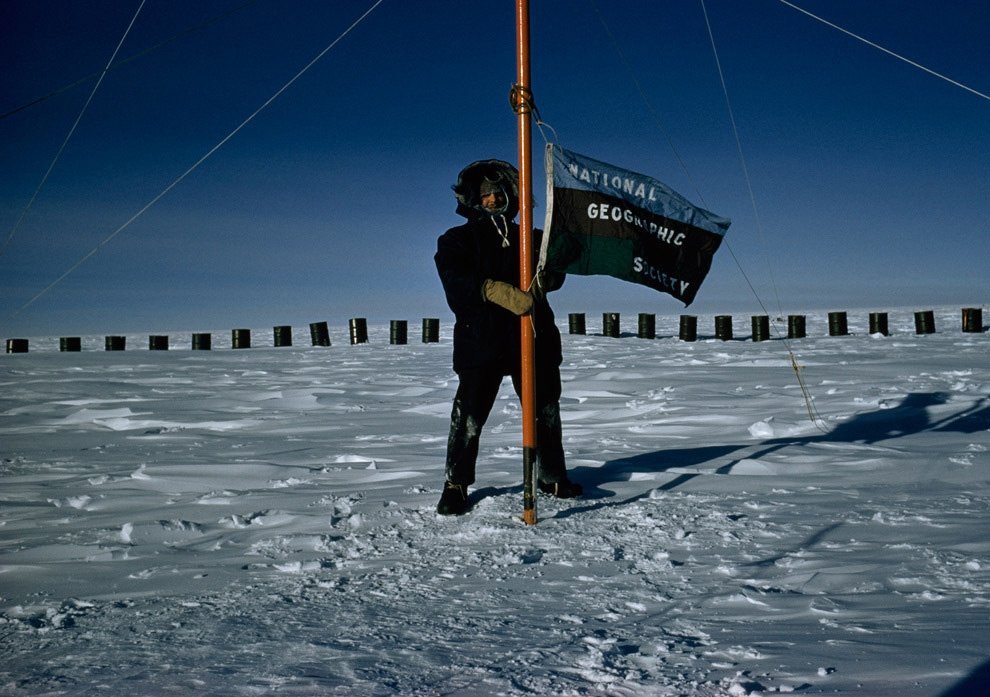 9. Південний полюс, Антарктида, 1957 рік. Томас Аберкромбі (Thomas Abercrombie) з журналу «National Geographic Magazine» тримає прапор Національного географічного товариства. Він був першим кореспондентом, який побував на Південному полюсі. (Photo by Thomas J. Abercrombie)
