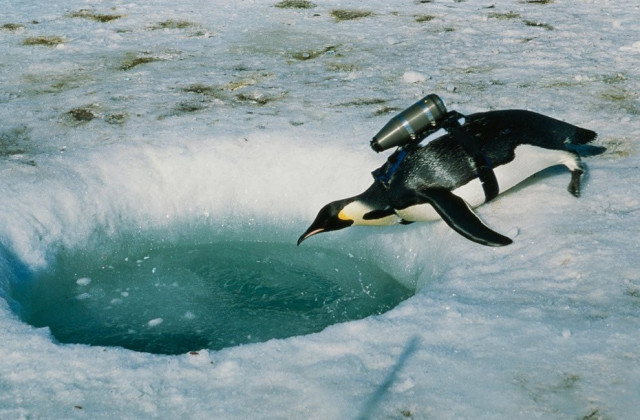 17. Антарктика. Імператорський пінгвін, на спині у якого закріплена камера Crittercam, розроблена морським біологом і співробітником National Geographic Грегом Маршаллом, стає таємним відеооператором National Geographic. (Photo by Greg Marshall)