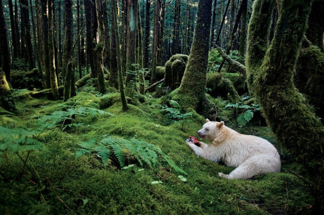 22. Британська Колумбія, Канада. У порослих мохом лісах Британської Колумбії тисячоліттями ростуть ялівці і водяться чорні ведмеді з білими шкурами. Цей вид чорного ведмедя називається кермодскій ведмідь. (Photo by Paul Nicklen)