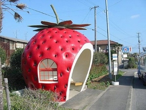 Чекати автобус на такій зупинці одне задоволення. Смакота! Автобусна зупинка у вигляді полуниці в Японії.