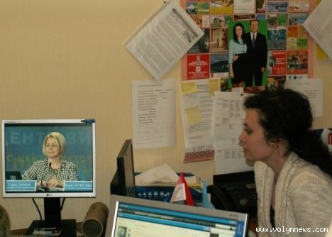 Прес-секретар обласної організації Партії Регіонів Ірина Комлик дивиться телевізор у штабі партії в ніч підрахунку голосів після другого туру виборів Президента України 8 лютого.