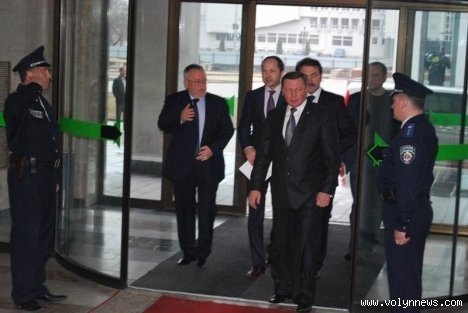 Нові керівники Волинської ОДА - голова Борис Клімчук, перший заступник Олександр Башкаленко, попередній губернатор Микола Романюк та віце-прем'єр Сергій Тігіпко заходять до приміщення ОДА в день представлення нового губернатора Волині 28 березня.