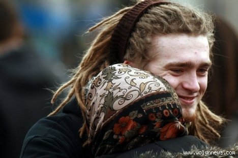 Учасник флешмобу до Дня обіймів, коли близько 50 молодих людей із плакатами «обійми мене», «безкоштовні обійми», «Free Hugs» пройшли центральними площами Луцька і обнімалися з перехожими 29 березня.