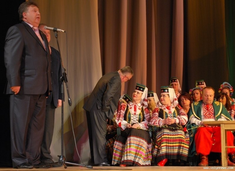 Губернатор Борис Клімчук шушукається з артистками під час виголошення промови головою облради Анатолієм Грицюком на святкуванні 70-річчя Волинської обласної філармонії 24 квітня.