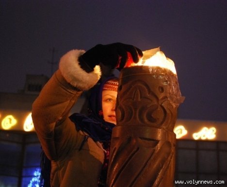 Дівчина бере вогник від великої свічі, встановленої у центрі Луцька і запаленої від Віфлиємського вогню на Другому етно-фестивалі «Різдво у Волинській родині» 9 січня та Театральному майдані Луцька.