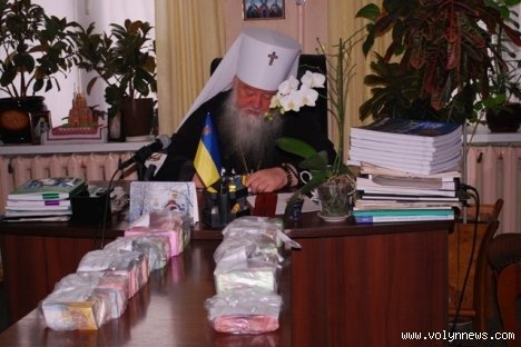 Митрополит Луцький і Волинський Ніфонт вручає наколядовані 160 тисяч гривень представникам восьми волинських дитячих будинків 28 січня.